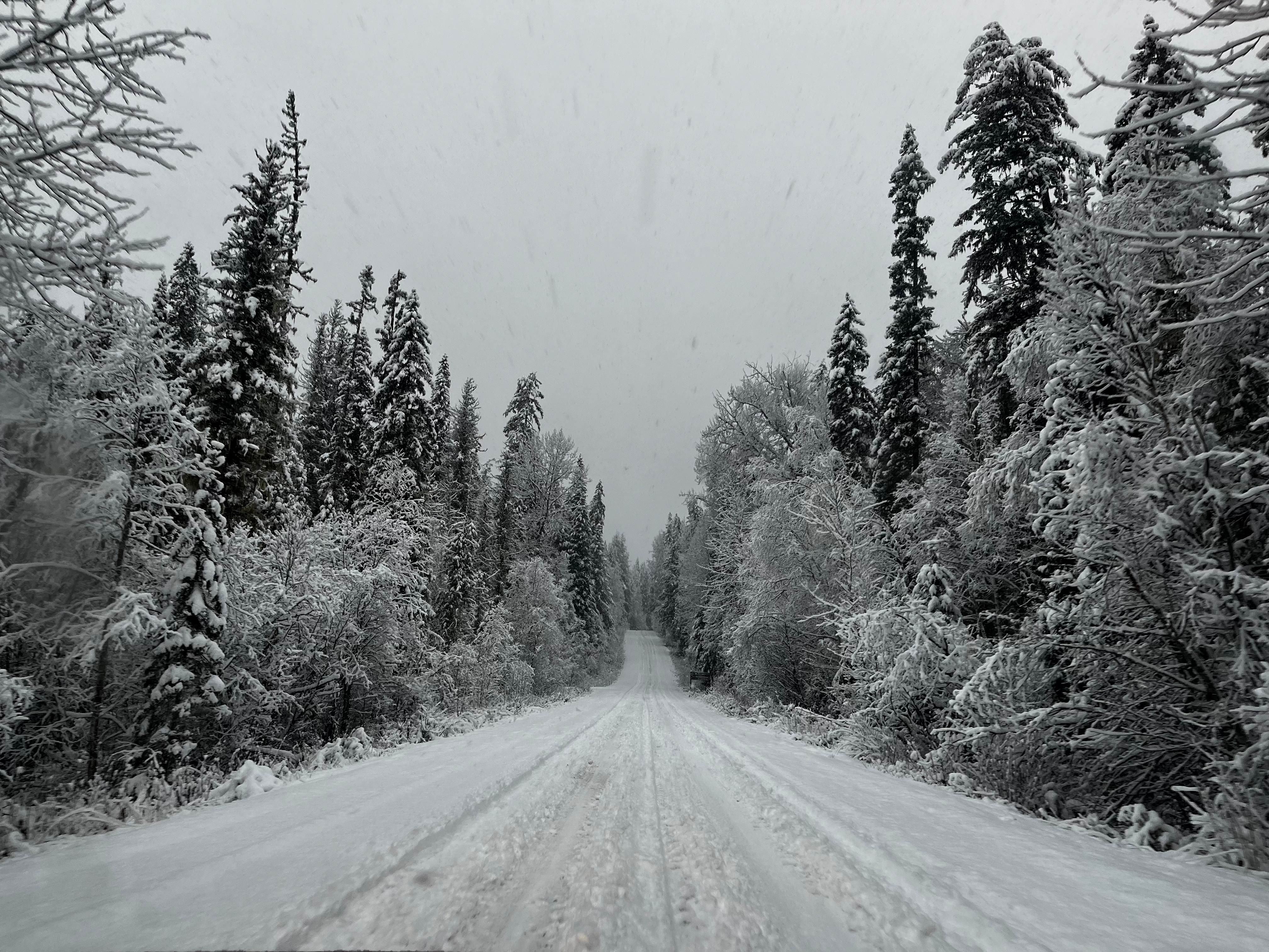 Der Weg ist wirklich wunderschön und wir sind ziemlich entspannt – zumindest solange sich vor uns auf der Straße noch Reifenspuren befinden. Diese lassen aber bald nach und wir müssen entscheiden, ob wir uns mit dem Auto in den Schnee wagen. Sebastian macht sich Sorgen über den anhaltenden Schneefall und befürchtet, da er mit dem Auto noch keine solche Wetterlage hatte, dass wir einfach stecken bleiben und nicht mehr zurückkommen. Wir zählen also die Kilometer bis zum letzten Haus und checken immer mal wieder das Netz, um abgesichert zu sein – schließlich wagen wir es in den Schnee und sind beide extrem überrascht, wie gut es funktioniert! Als wären kanadische Autos für genau so Wetter gemacht …